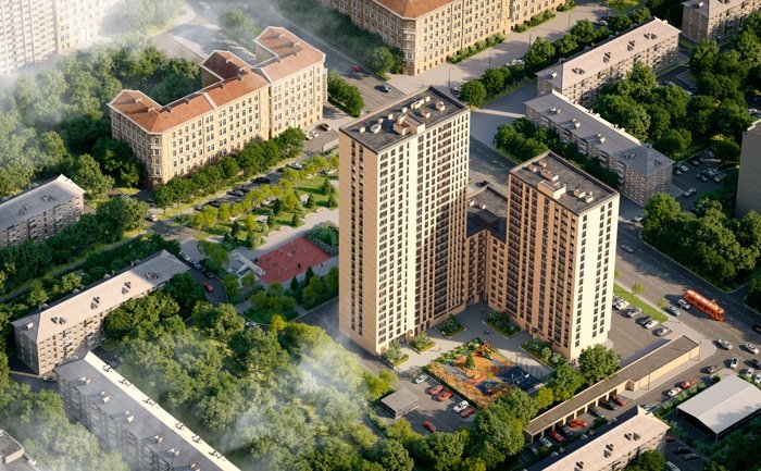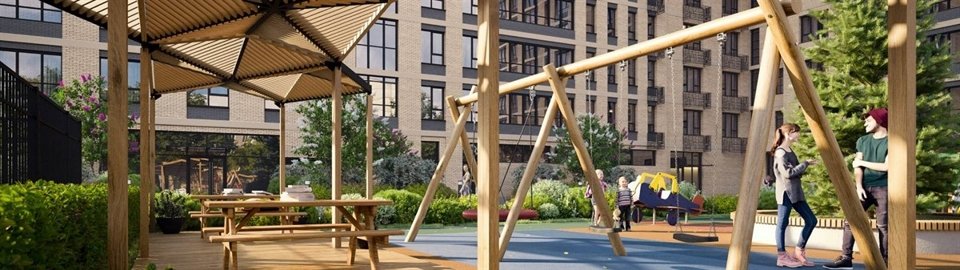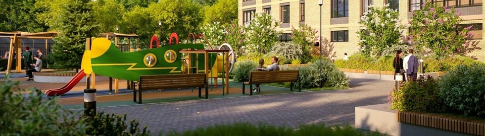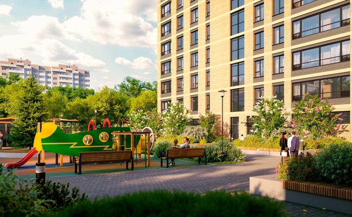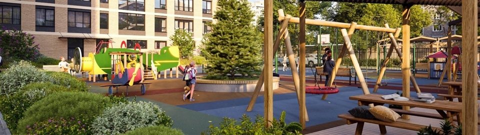 В жилом комплексе выполнены ландшафтный дизайн и умное зонирование двора, где расположены детские площадки, территория спорта с тренажёрами, игровые комплексы и зоны для отдыха. Для удобства и безопасности на площадках предусмотрено резиновое покрытие. Закрытая территория и концепция «двор без машин» — является дополнительным преимуществом ЖК.