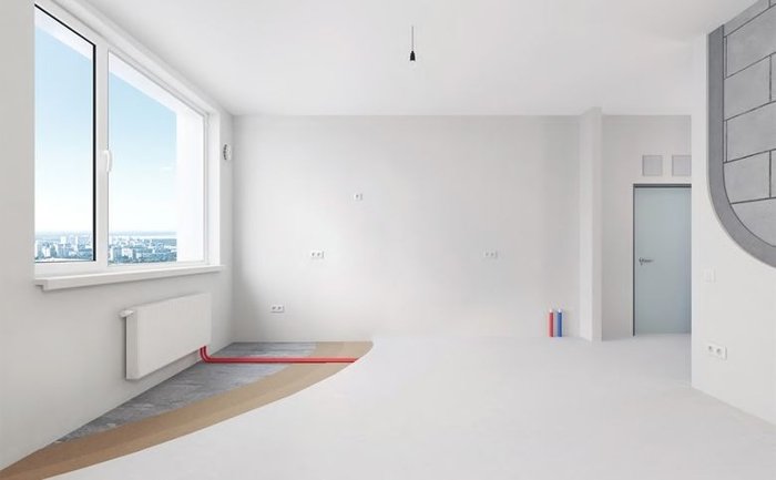 Сантехника: горизонтальная разводка отопления, радиатор с терморегулятором